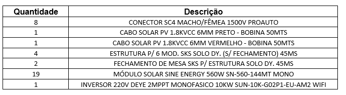 Kit geração 10,64kwp mon. 220v inversor Deye 10kW e placas Sine 560w para estrutura solo