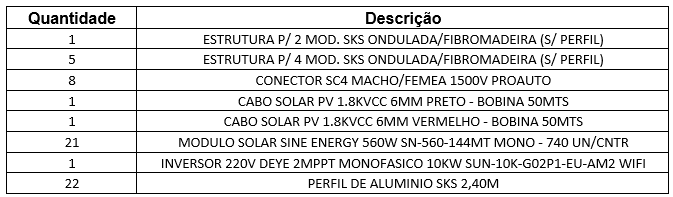 Kit geração 11,76kwp mon. 220v inversor Deye 10kW e placas Sine 560w para estrutura fibromadeira/fibrocimento