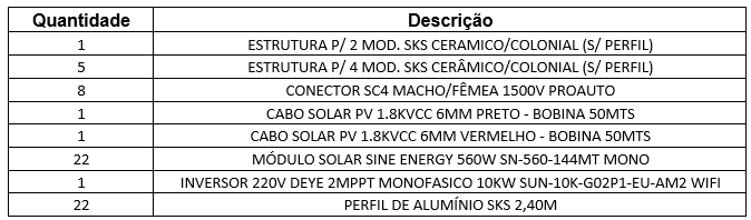 Kit geração 12,32kwp mon. 220v inversor Deye 10kW e placas Sine 560w para estrutura colonial