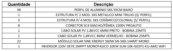 Kit geração 12,32kwp mon. 220v inversor Deye 10kW e placas Sine 560w para estrutura metálica