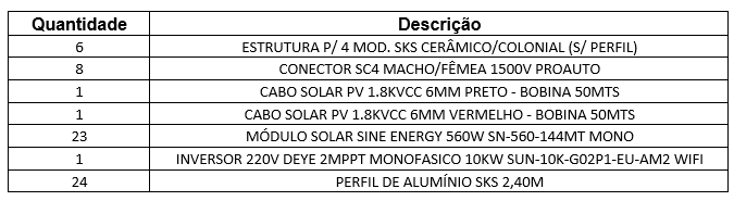 Kit geração 12,88kwp mon. 220v inversor Deye 10kW e placas Sine 560w para estrutura colonial