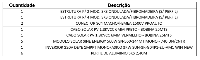 Kit geração 2,80kwp mon. 220v inversor Deye 3kW e placas Sine 560w para estrutura fibromadeira/fibrocimento