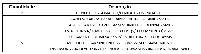 Kit geração 2,80kwp mon. 220v inversor Deye 3kW e placas Sine 560w para estrutura solo