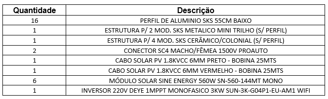 Kit geração 3,36kwp mon. 220v inversor Deye 3kW e placas Sine 560w para estrutura metálica