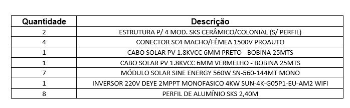 Kit geração 3,92kwp mon. 220v inversor Deye 4kW e placas Sine 560w para estrutura colonial