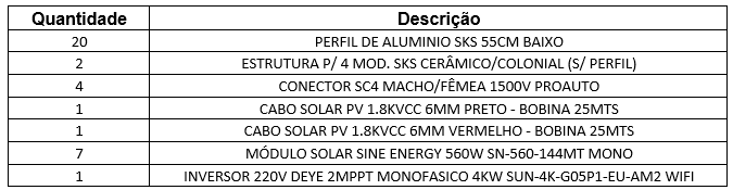 Kit geração 3,92kwp mon. 220v inversor Deye 4kW e placas Sine 560w para estrutura metálica