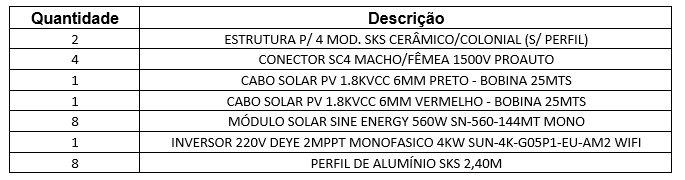Kit geração 4,48kwp mon. 220v inversor Deye 4kW e placas Sine 560w para estrutura colonial