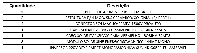 Kit geração 4,48kwp mon. 220v inversor Deye 4kW e placas Sine 560w para estrutura metálica
