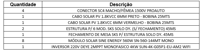 Kit geração 4,48kwp mon. 220v inversor Deye 4kW e placas Sine 560w para estrutura solo
