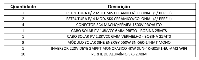 Kit geração 5,04kwp mon. 220v inversor Deye 4kW e placas Sine 560w para estrutura colonial
