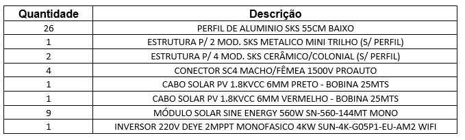 Kit geração 5,04kwp mon. 220v inversor Deye 4kW e placas Sine 560w para estrutura metálica