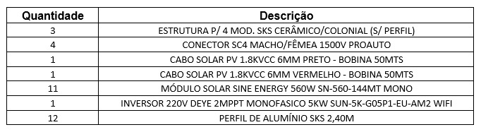 Kit geração 6,16kwp mon. 220v inversor Deye 5kW e placas Sine 560w para estrutura colonial