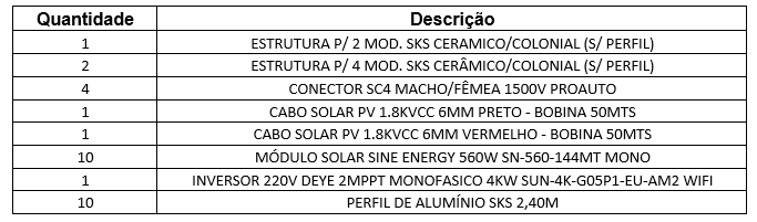 Kit geração 5,60kwp mon. 220v inversor Deye 5kW e placas Sine 560w para estrutura colonial