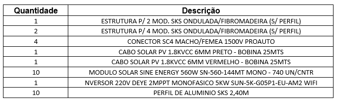 Kit geração 5,60kwp mon. 220v inversor Deye 5kW e placas Sine 560w para estrutura fibromadeira/fibrocimento