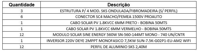 Kit geração 6,72kwp mon. 220v inversor Deye 7,5kW e placas Sine 560w para estrutura fibromadeira/fibrocimento