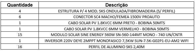 Kit geração 8,40kwp mon. 220v inversor Deye 7,5kW e placas Sine 560w para estrutura fibromadeira/fibrocimento
