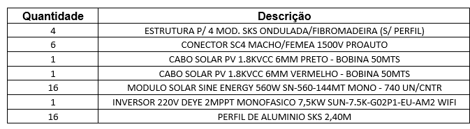 Kit geração 8,96kwp mon. 220v inversor Deye 7,5kW e placas Sine 560w para estrutura fibromadeira/fibrocimento