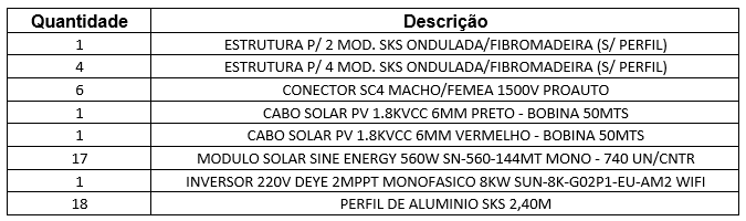 Kit geração 9,52kwp mon. 220v inversor Deye 8kW e placas Sine 560w para estrutura fibromadeira/fibrocimento